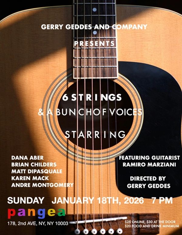 The latest edition of music & spoken word by Gerry Geddes & Co. with the added fun twist of being all accompanied by the wonderful Ramiro Marziani on guitar. A cool mix of songs and a warm, cozy acoustic vibe. Tix on sale now at www.pangeanyc.com